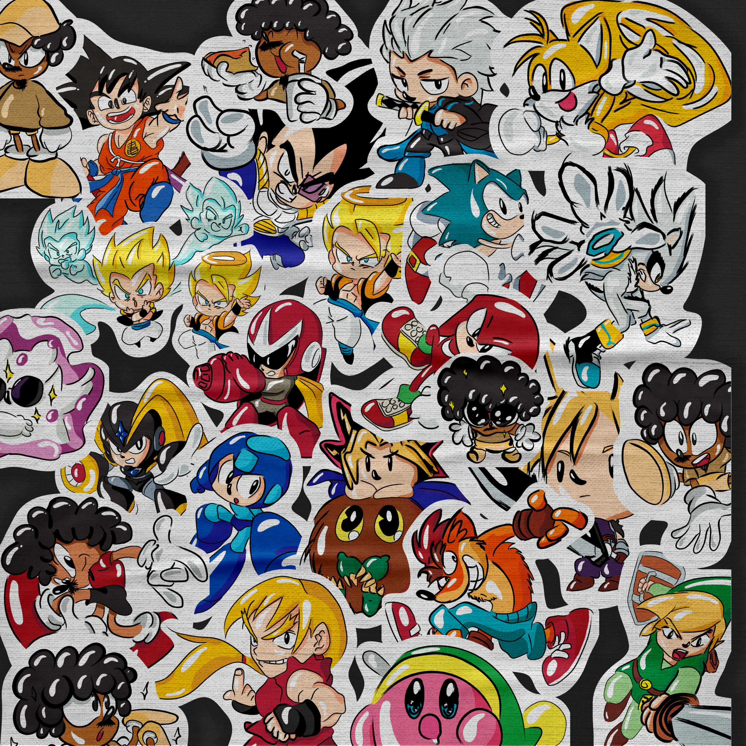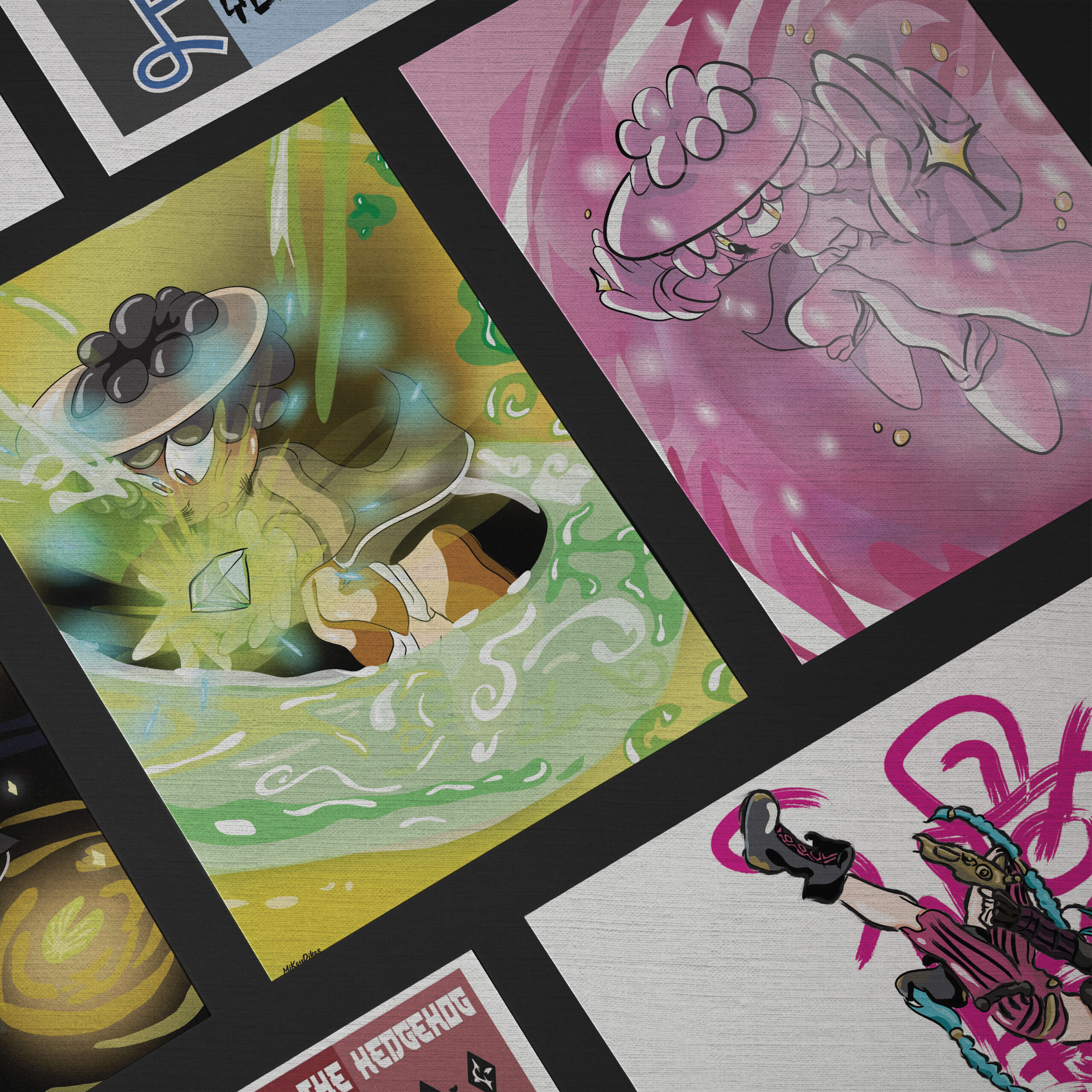 Illustrations in the form of prints, stickers, and merchandise that are reminiscent of the Inkblot Cartoon Style, featuring a rubbery and shiny appearance.